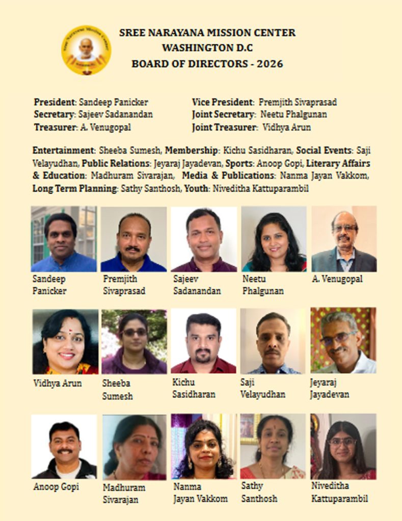 വാഷിംഗ്ടൻ ഡിസി: അമേരിക്കയുടെ തലസ്ഥാനമായ വാഷിംഗ്ടൻ ഡിസി ആസ്ഥാനമായി കഴിഞ്ഞ ഇരുപത്തിയഞ്ചു വർഷത്തിൽ ഏറെയായി പ്രവർത്തിക്കുന്ന പ്രമുഖ ശ്രീനാരായണ സംഘടനയായ ശ്രീനാരായണ മിഷൻ സെന്ററിന്റെ 2026 വർഷത്തിലേക്കുള്ള ഭാരവാഹികളെ തിരഞ്ഞെടുത്തു. ഡിസംബർ ഏഴാം തീയതി വാഷിംഗ്ടൻ ഡിസിക്ക് സമീപമുള്ള എൽക്റിഡ്ജ് പബ്ലിക് ലൈബ്രറിയിൽ വച്ച് നടന്ന വാർഷിക പൊതുയോഗത്തിൽ വച്ചാണ് പുതിയ ഭാരവാഹികളെ എതിരില്ലാതെ തിരഞ്ഞെടുത്തത്.